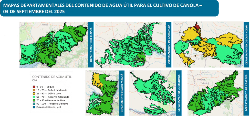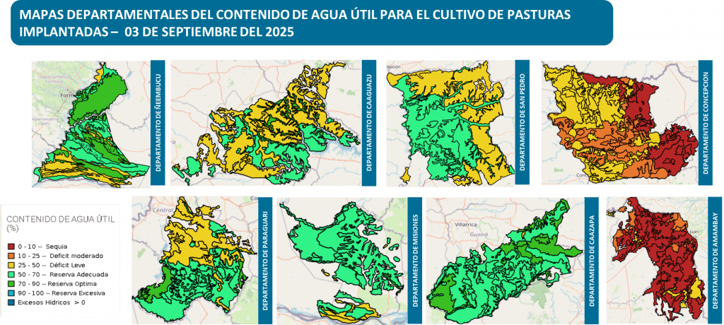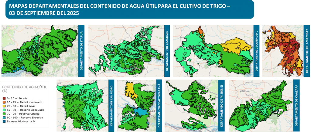 Las condiciones de disponibilidad de agua en el suelo, al día 03 de septiembre del 2025, para los departamentos analizados, presentan estados que se encuentran entre “Sequia (0-10%) y Reserva Optima (70-90%)”. En esta fecha de análisis, la mayoría de los suelos se encuentran con reserva de humedad en relación a las necesidades hídricas del cultivo, estas condiciones estarían asociadas al régimen pluviométrico, las características físicas de los suelos y la evapotranspiración.
