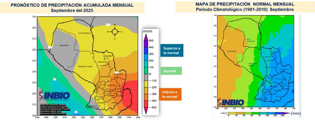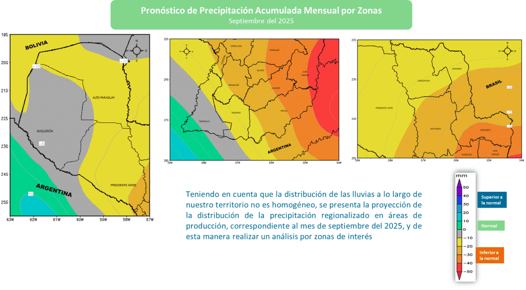 El pronóstico de precipitación acumulada para el mes de septiembre, sigue mostrando un escenario con lluvias inferiores al rango normal en gran parte del territorio nacional, especialmente en la Región Oriental. A pesar de que durante los primeros días del mes se estan registraron acumulados favorables de lluvias, las salidas de los modelos climáticos indican que, en el transcurso del período analizado, predominarìan condiciones con una distribución irregular de las precipitaciones.