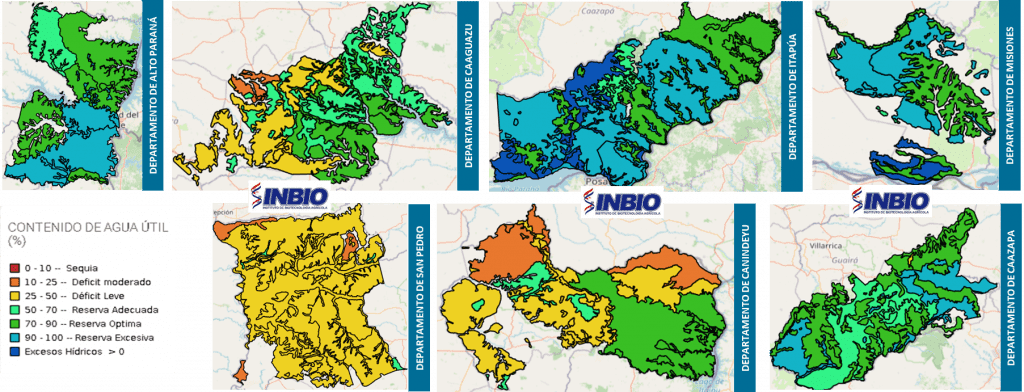 Las condiciones de disponibilidad de agua en el suelo, al día 08 de octubre del 2025, para los departamentos analizados, presentan estados que se encuentran entre “Déficit Moderado (10-25%) y Excesos Hídricos”. En la fase de emergencia, la mayoría de los suelos cuentan con reservas de humedad en relación a las necesidades hídricas del cultivo, estas condiciones estarían asociadas al régimen pluviométrico, las características físicas de los suelos y la evapotranspiración.
