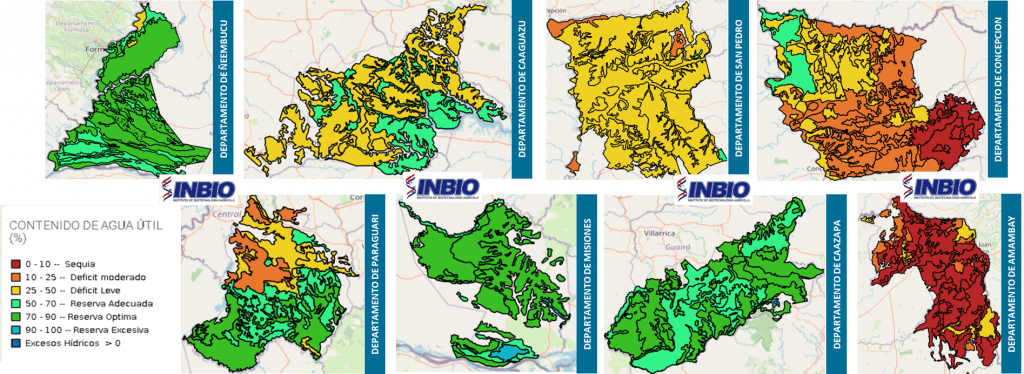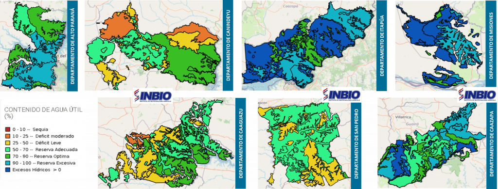 Las condiciones de disponibilidad de agua en el suelo, al día 08 de octubre del 2025, para los departamentos analizados, presentan estados que se encuentran entre “Sequia (0-10%) y Reserva Excesiva (90-100%)”. En esta fecha de análisis, la mayoría de los suelos cuentan con reservas de humedad en relación a las necesidades hídricas del cultivo, estas condiciones estarían asociadas al régimen pluviométrico, las características físicas de los suelos y la evapotranspiración.