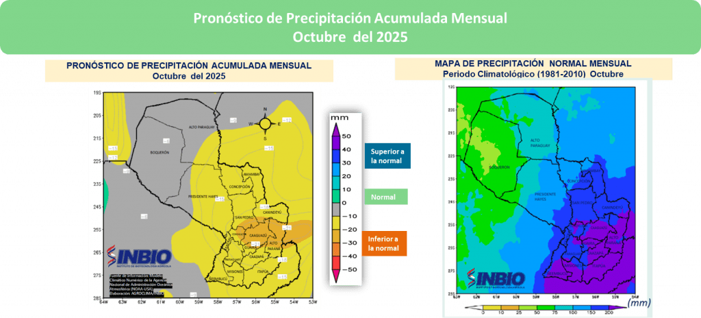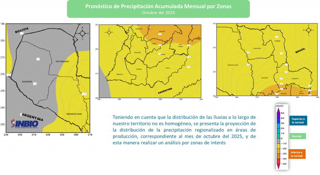 La actualización del pronóstico de precipitación acumulada para el mes de octubre, indica valores ligeramente inferiores a los normales en gran parte del territorio nacional, principalmente en la Región Oriental y en sectores del centro y sur de la Región Occidental. No obstante, las precipitaciones registradas en las últimas semanas han contribuido a la recarga de humedad en el perfil del suelo, lo que permitirá sostener condiciones hídricas favorables durante gran parte del mes. En este contexto, se prevé que octubre culmine con niveles adecuados de reservas de humedad en el suelo, lo que favorecerá el desarrollo fisiológico de los cultivos de zafra.