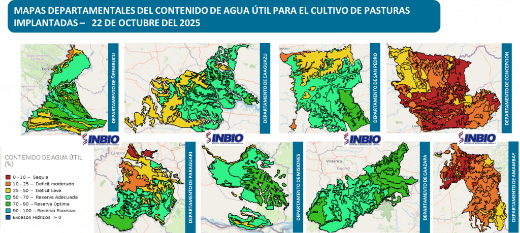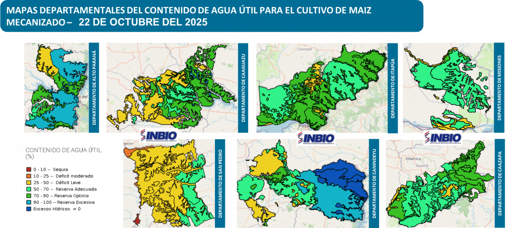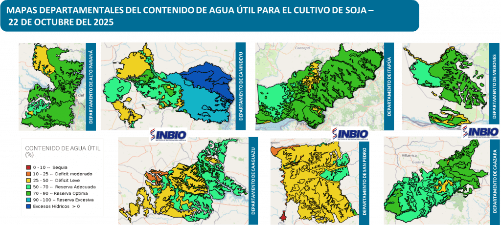 Las condiciones de disponibilidad de agua en el suelo, al día 22 de octubre del 2025, para los departamentos analizados, presentan estados que se encuentran entre “Sequia (0-10%) y Excesos Hídricos”. En esta fecha de análisis, durante la fase de emergencia, la mayoría de los suelos cuentan con reservas de humedad en relación a las necesidades hídricas del cultivo, estas condiciones estarían asociadas al régimen pluviométrico, las características físicas de los suelos y la evapotranspiración.