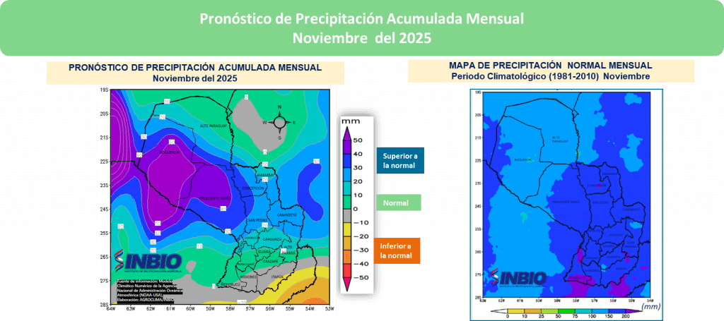 La actualización del pronóstico de precipitación acumulada para el mes de noviembre, muestra variabilidad espacial en la distribución de las lluvias a nivel nacional. Se prevén valores superiores a la normal a ligeramente inferiores a lo normal en amplios sectores del centro y sureste de la Región Oriental, mientras que hacia el extremo oeste de la Región Occidental se estiman precipitaciones superiores a lo que normalmente llueve en este periodo.