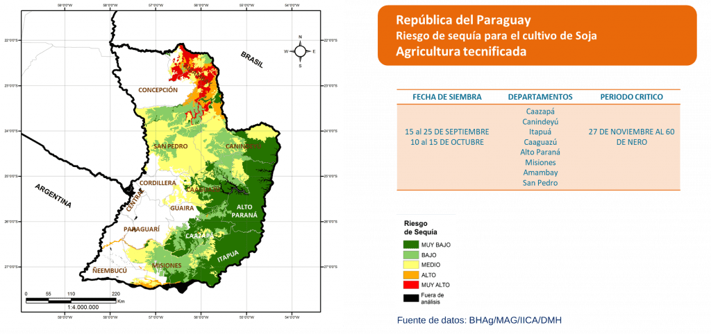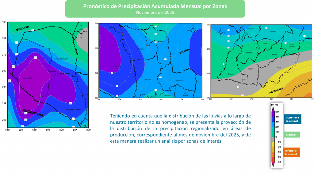 Particularmente, en el centro, norte y noreste de la Región Oriental, que comprende zonas productivas de San Pedro, Caaguazú, Concepción, Canindeyù y parte de Amambay, las proyecciones marcan condiciones favorables de acumulados de lluvias en relación a lo normal, con condiciones que delinean un gradiente más positivo hacia el norte, favoreciendo aportes hídricos por encima de los 150 mm. Durante este mes, las siembras tempranas ingresarían a fases fenológicas críticas, etapas con altos requerimientos hídricos, lo que mitiga riesgos de déficit y promueve un óptimo desarrollo.
