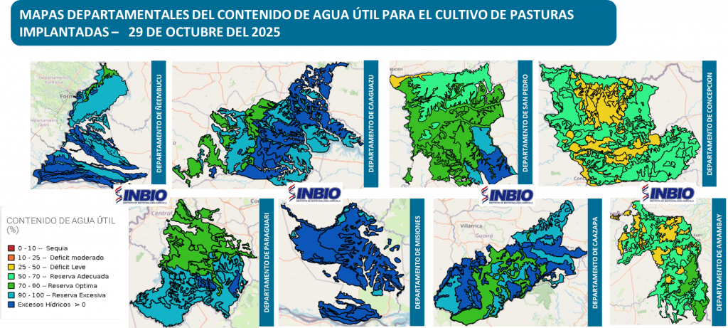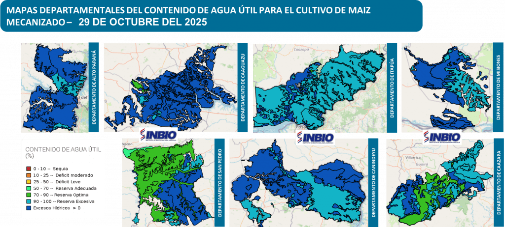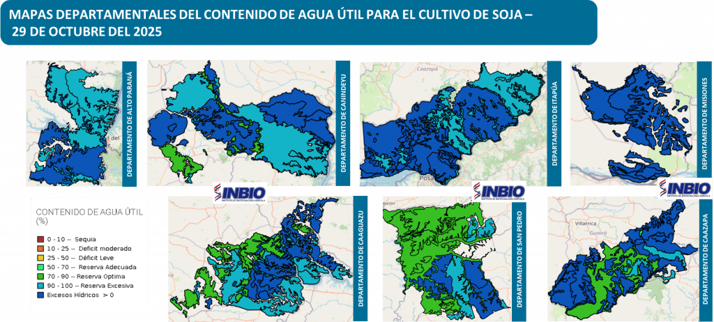 Las condiciones de disponibilidad de agua en el suelo, al día 29 de octubre del 2025, para los departamentos analizados, presentan estados que se encuentran entre “Déficit Leve (25-50%) y Excesos Hídricos”. En esta fecha de análisis, la mayoría de los suelos cuentan con reservas de humedad en relación a las necesidades hídricas del cultivo, estas condiciones estarían asociadas al régimen pluviométrico, las características físicas de los suelos y la evapotranspiración.