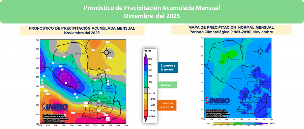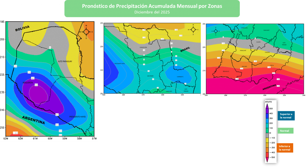 Se prevén acumulados por encima de lo habitual con rangos más elevados principalmente sobre el oeste y norte del país, abarcando zonas de Boquerón, Alto Paraguay y Presidente Hayes. En la Región Oriental, los valores tenderían a situarse dentro del rango normal a moderadamente superior, especialmente en áreas agrícolas de San Pedro, Caaguazú, Concepción, Canindeyú y Alto Paranà.