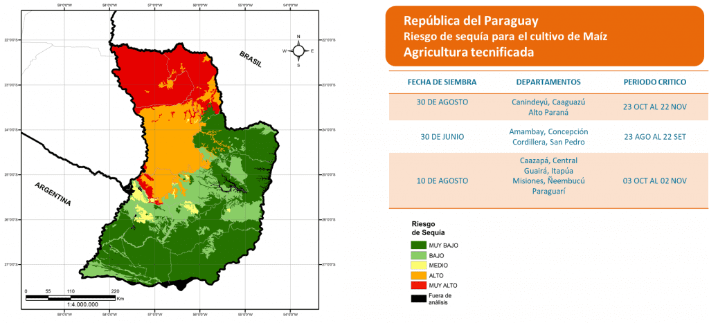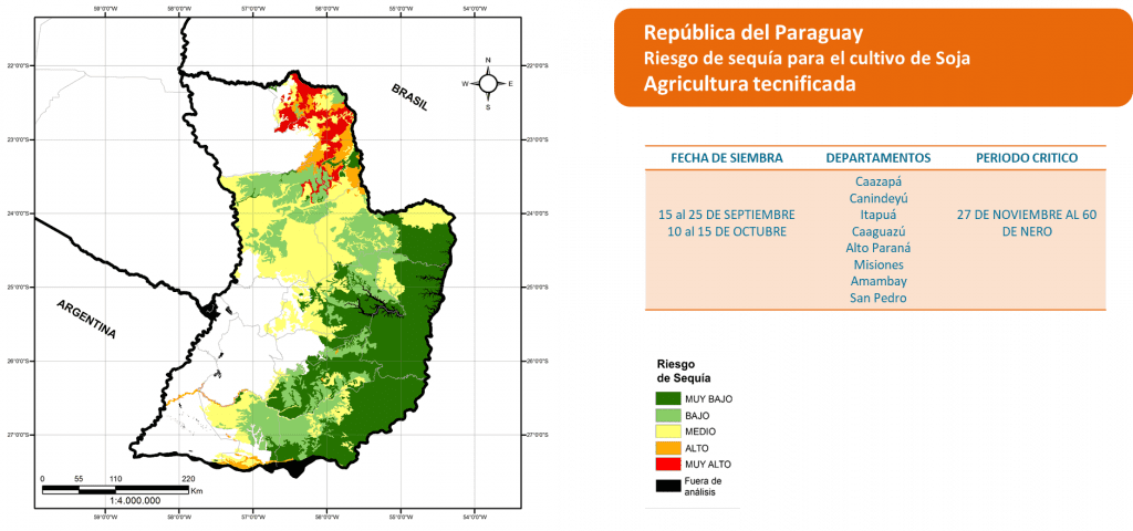 Estas condiciones contribuirían a mantener una adecuada disponibilidad hídrica en el perfil del suelo, para los cultivos de siembra temprana que, durante el próximo mes, ingresaran a etapas fenológicas de alta demanda hídrica, reduciendo el riesgo de estrés por déficit y promoviendo un desarrollo fisiológico óptimo. En la zona sur de la Región Oriental se estiman valores de precipitación por debajo de los rangos normales, lo que sugiere un escenario de elevada variabilidad temporal. Esta condición podría generar periodos con distribución irregular de lluvias, que activarían posibles incrementando el riesgo de déficits hídricos