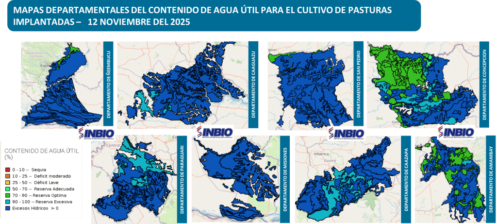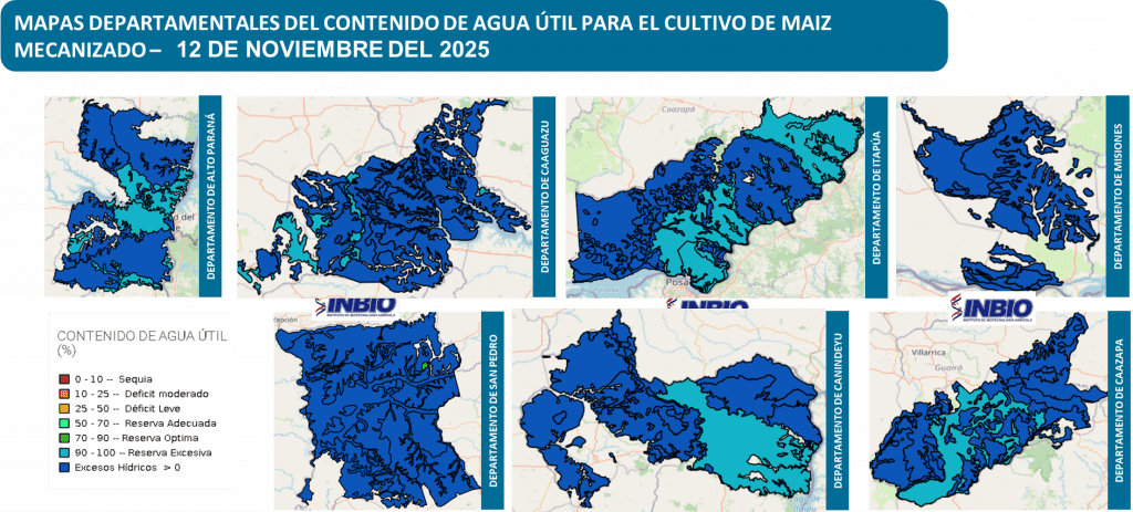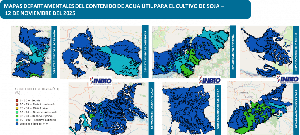 Las condiciones de disponibilidad de agua en el suelo, al día 12 de noviembre del 2025, para los departamentos analizados, presentan estados que se encuentran entre “Reserva Optima (70-90%) y Excesos Hídricos”. En esta fecha de análisis, durante la fase de crecimiento, la mayoría de los suelos se encuentran saturados de humedad en relación a las necesidades hídricas del cultivo, estas condiciones estarían asociadas al régimen pluviométrico, las características físicas de los suelos y la evapotranspiración.