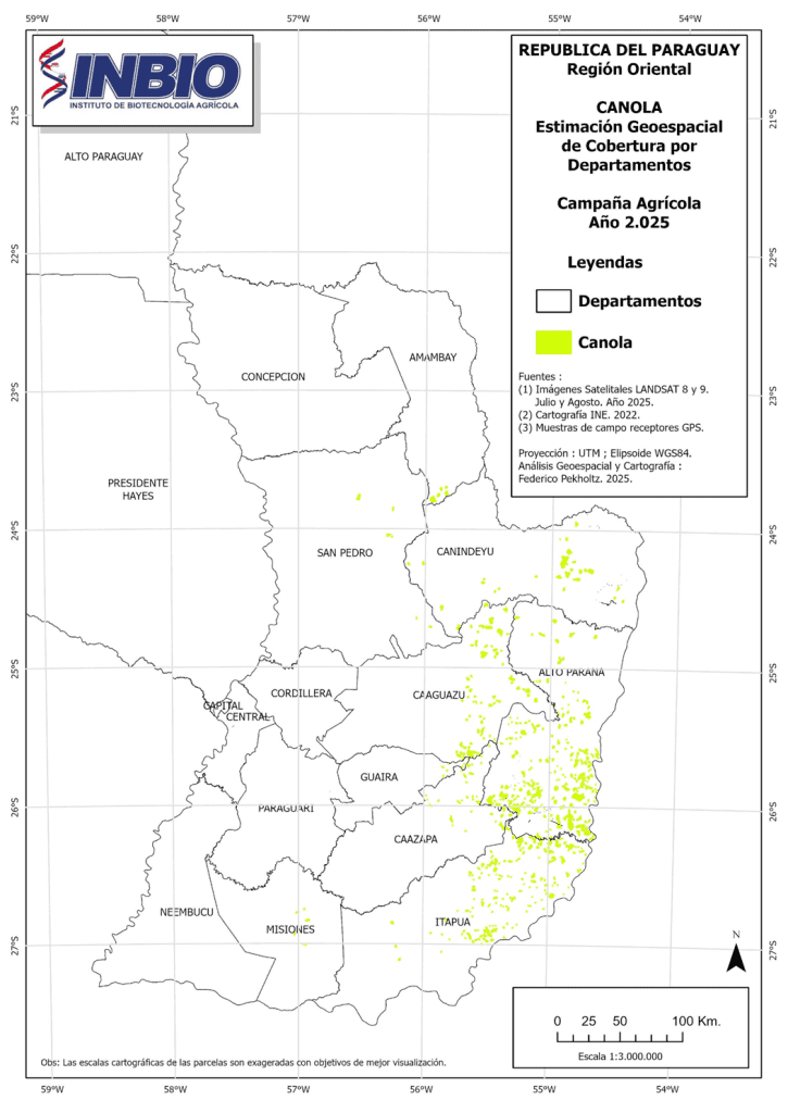 Respecto al cultivo de la canola el informe del INBIO revela que en el 2025 se sembró 74.244 hectáreas, unas 10.885 hectáreas más que el año anterior, cuando el área había sido de 63.359 hectáreas de superficie de la canola. Si bien en el año anterior el cultivo de canola tuvo su segunda gran caída de los últimos años, se puede observar que el interés en el cultivo está estabilizándose.