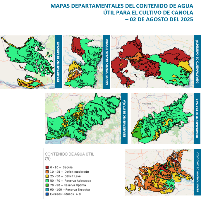 De acuerdo a lo observado, las condiciones de disponibilidad de agua en las unidades de suelos de los Departamentos monitoreados, presentan estados que se encuentran entre “Sequia (0-10%) y Reserva Excesiva (90-100%)”. A la fecha de análisis la mayoría de los suelos cuentan con reservas de humedad en relación a las necesidades hídricas del cultivo. Estas condiciones estarían asociadas al régimen pluviométrico, las características físicas de los suelos y la evapotranspiración.