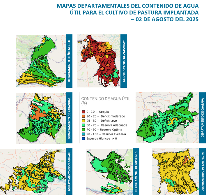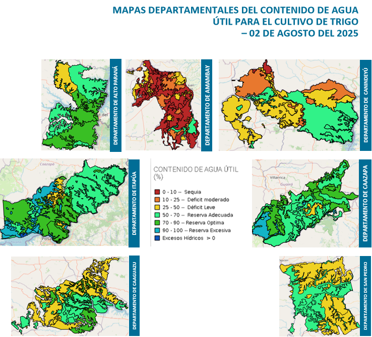 De acuerdo a lo observado, las condiciones de disponibilidad de agua en las unidades de suelos de los Departamentos monitoreados, presentan estados que se encuentran entre “Sequia (0-10%) y Reserva Optima (70-90%)”. A la fecha del análisis, la mayoría de los suelos cuentan con reserva de humedad de humedad en relación con las necesidades hídricas del cultivo. Estas condiciones estarían asociadas al régimen pluviométrico, las características físicas del suelo y la evapotranspiración.
