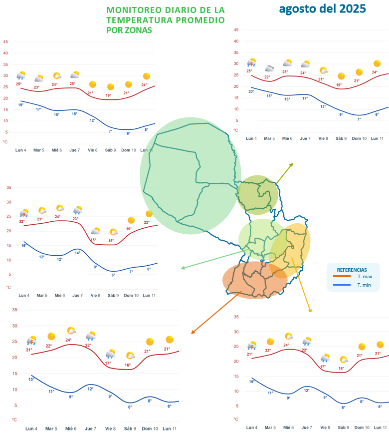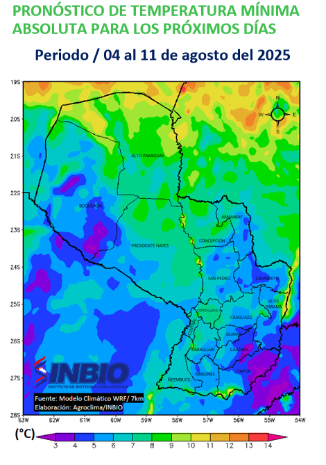 Según el pronóstico de temperatura mínima absoluta para los próximos días, se prevén valores predominantemente de entre 4 °C y 10 °C en la mayor parte del territorio nacional. Las temperaturas más bajas se concentrarían en el sureste de la Región Oriental, y en el oeste de la Región Occidental donde podrían registrarse mínimas puntuales cercanas a los 4°C, especialmente en zonas de topografía baja.