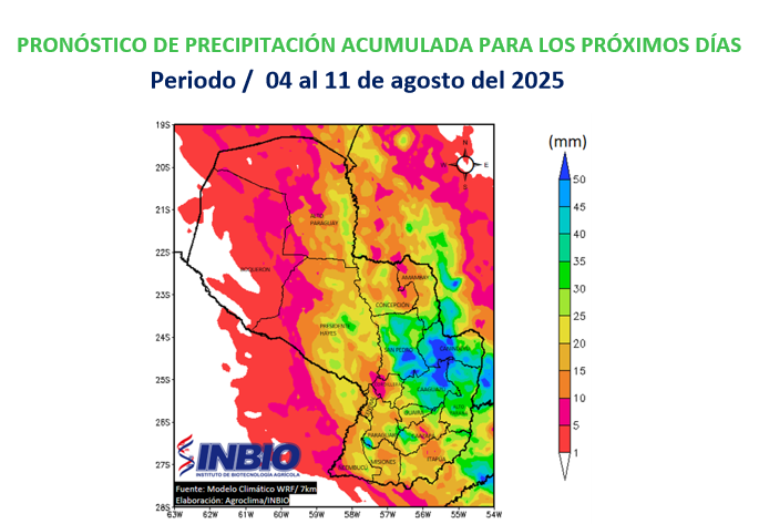 Por el contrario, en el suroeste (Misiones, Ñeembucú) y en el centro (Cordillera, Paraguarí), se prevén acumulaciones de entre 10-20 mm, lo cual proporcionará una humedad apropiada para el desarrollo óptimo de los cultivos. En contraste, para extensas áreas de la Región Occidental, se proyectan lluvias inferiores a 10 mm durante el periodo analizado.
