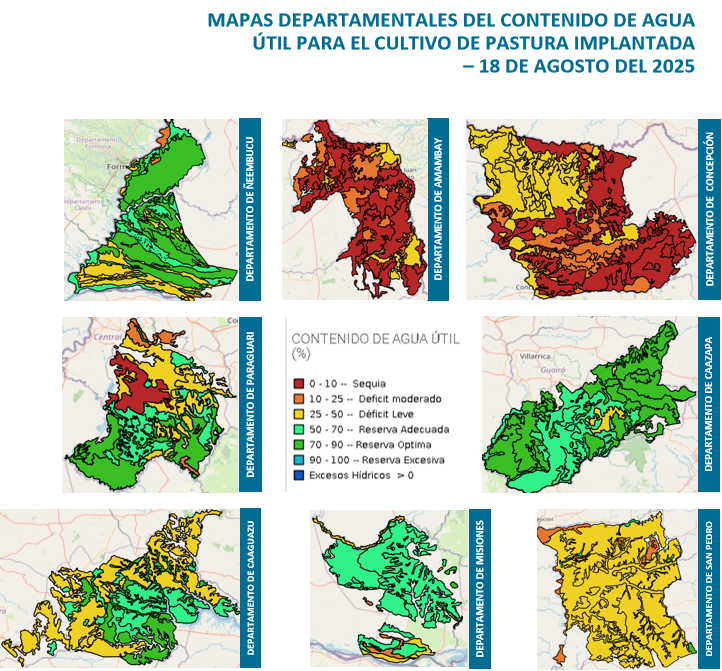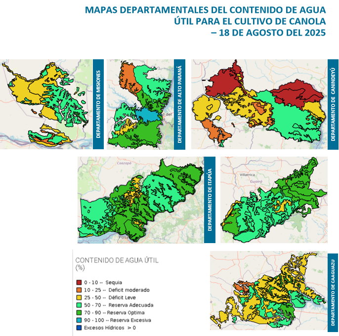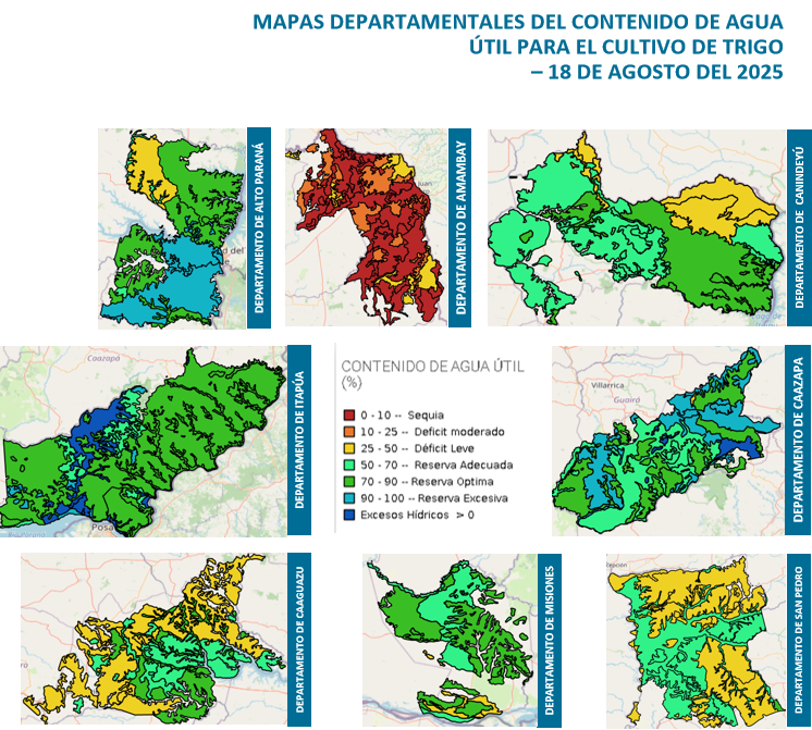 De acuerdo a lo observado, las condiciones de disponibilidad de agua en las unidades de suelos de los Departamentos monitoreados, presentan estados que se encuentran entre “Sequia (0-10%) y Excesos Hídricos”. A la fecha de análisis la mayoría de los suelos cuentan con reservas de humedad en relación a las necesidades hídricas del cultivo. Estas condiciones estarían asociadas al régimen pluviométrico, las características físicas de los suelos y la evapotranspiración.