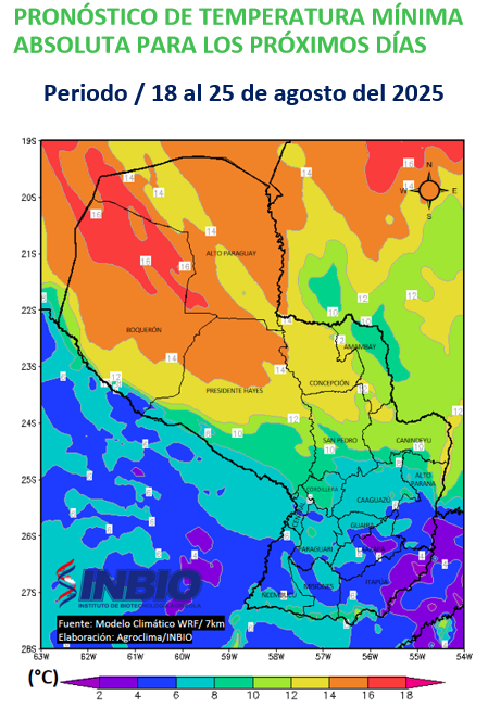 Durante el periodo analizado, las temperaturas mínimas absolutas se proyectan mayormente en un rango de 4 °C a 16 °C en gran parte del territorio nacional. Los valores más bajos, cercanos a 4 °C, podrían presentarse en zonas de topografía baja del sur de la Región Oriental, mientras que las mínimas más elevadas (entre 14 °C y 16 °C) se concentrarían en sectores específicos del Alto Chaco.