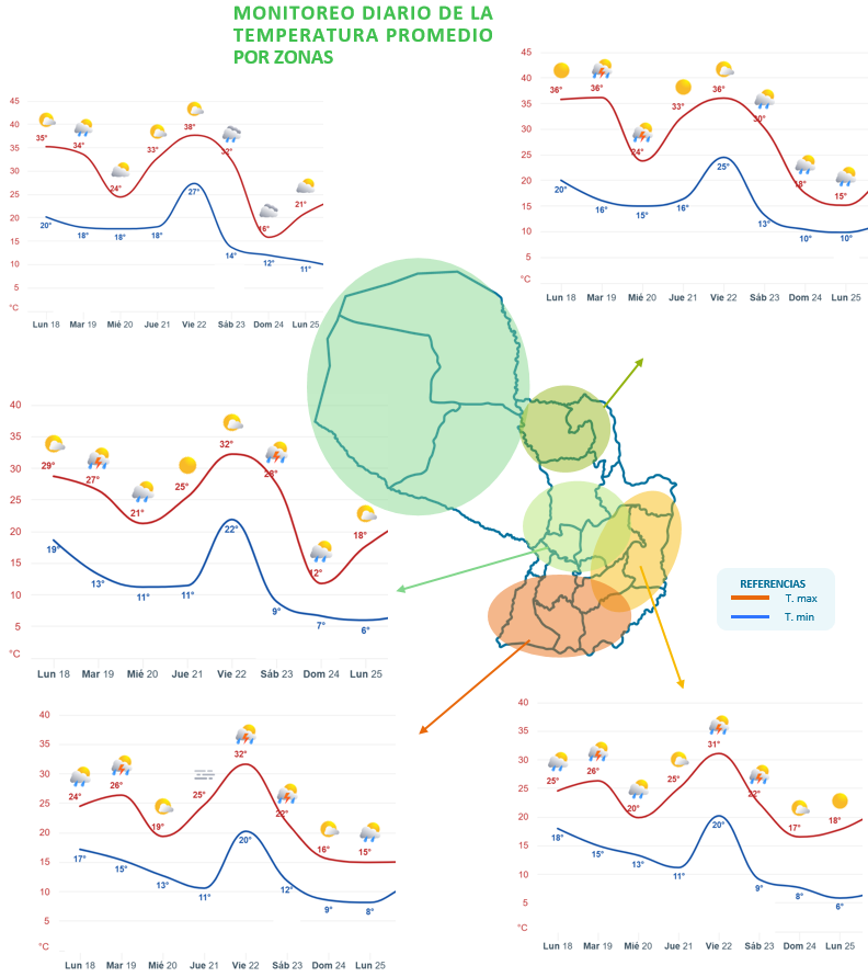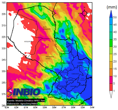 Se anticipan precipitaciones importantes en gran parte de la Región Oriental, con volúmenes acumulados que podrían exceder los 30 a 50 mm. Estas condiciones propiciarán una óptima recarga hídrica en el perfil del suelo, lo cual beneficiará a los cultivos de invierno en su fase de desarrollo y contribuirá positivamente a la preparación para las siembras tempranas de los cultivos de zafra.