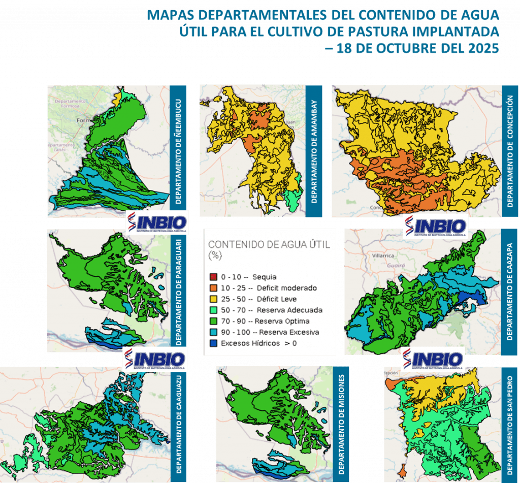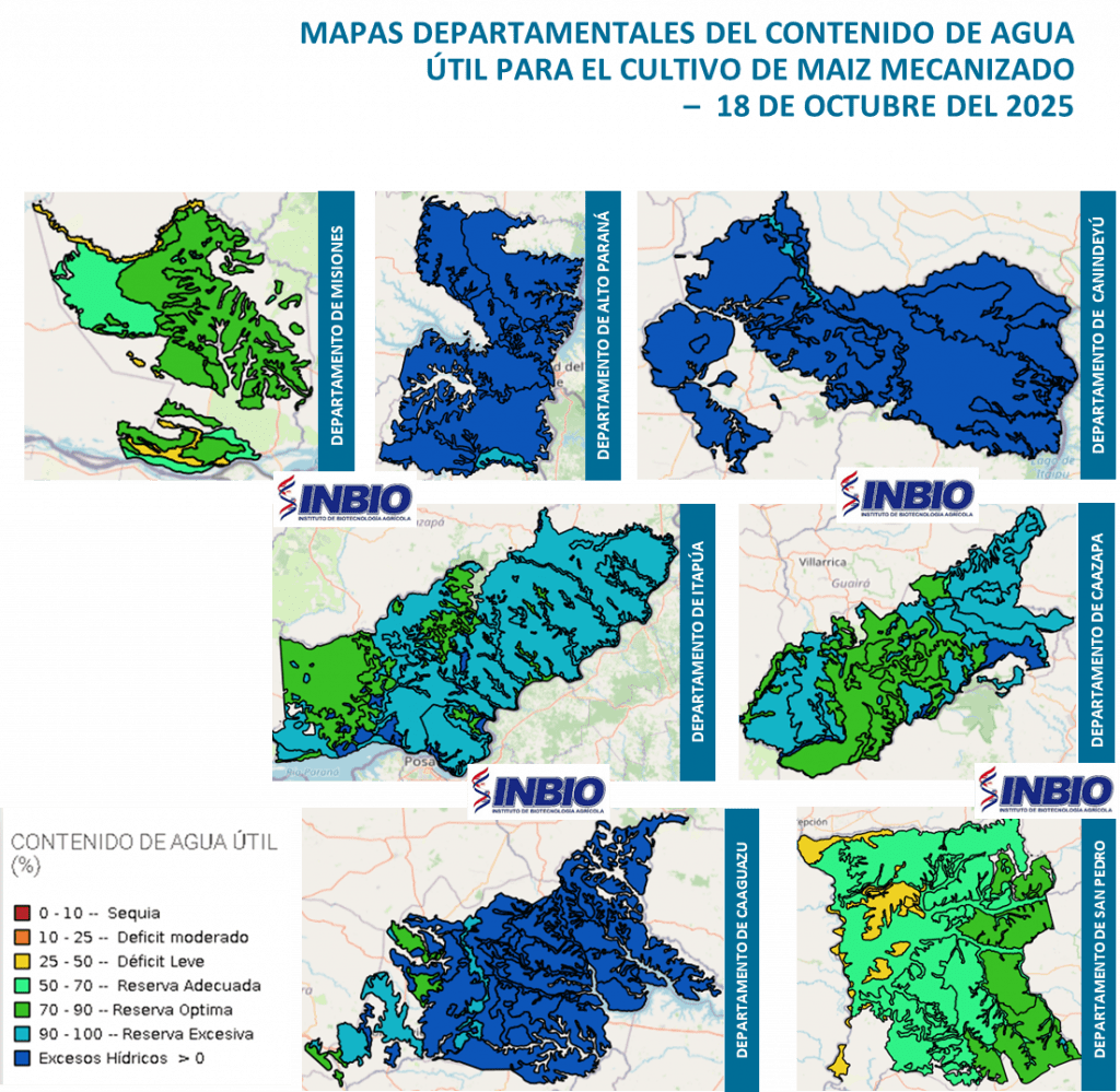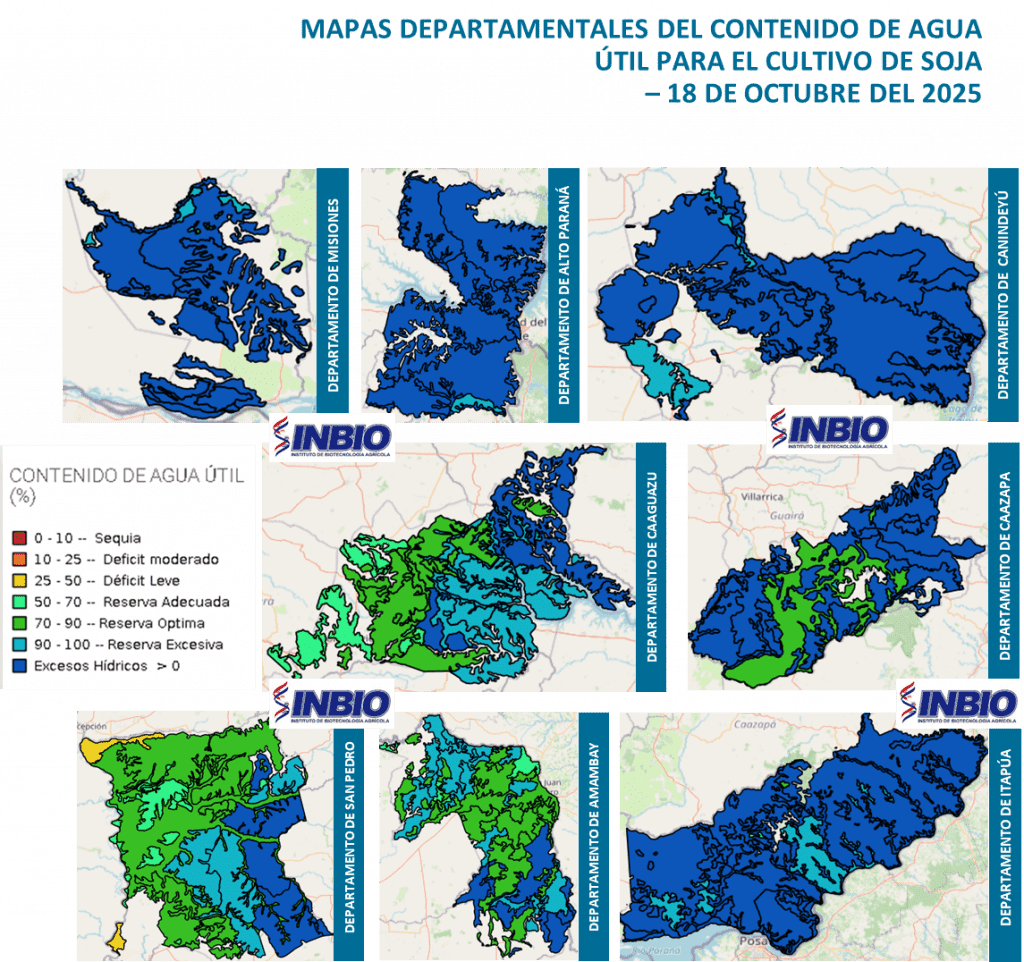 De acuerdo a lo observado, las condiciones de disponibilidad de agua en las unidades de suelos de los Departamentos monitoreados, presentan estados que se encuentran entre “Déficit Moderado (10-25%) y Excesos Hídricos”. A la fecha del análisis, la mayoría de los suelos cuentan con reservas de humedad en relación a las necesidades hídricas del cultivo. Estas condiciones estarían asociadas al régimen pluviométrico, las características físicas del suelo y la evapotranspiración.