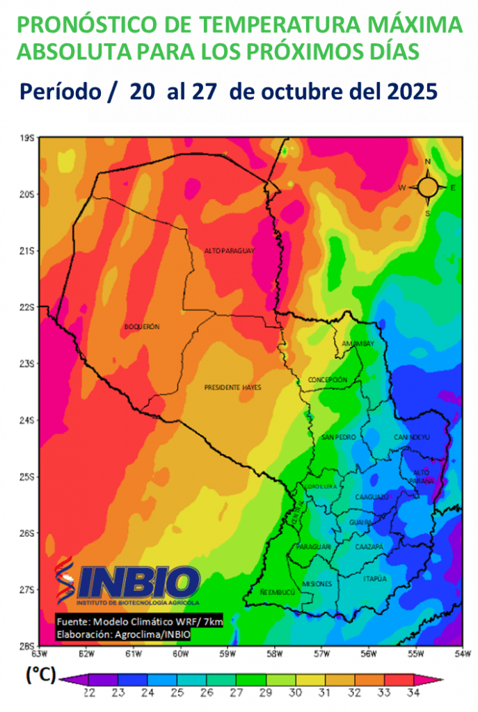 El análisis del pronóstico de temperatura máxima absoluta para los próximos días predice un gradual aumento de las temperaturas en gran parte del territorio nacional, particularmente sobre el Alto Chaco y el norte de la Región Oriental.