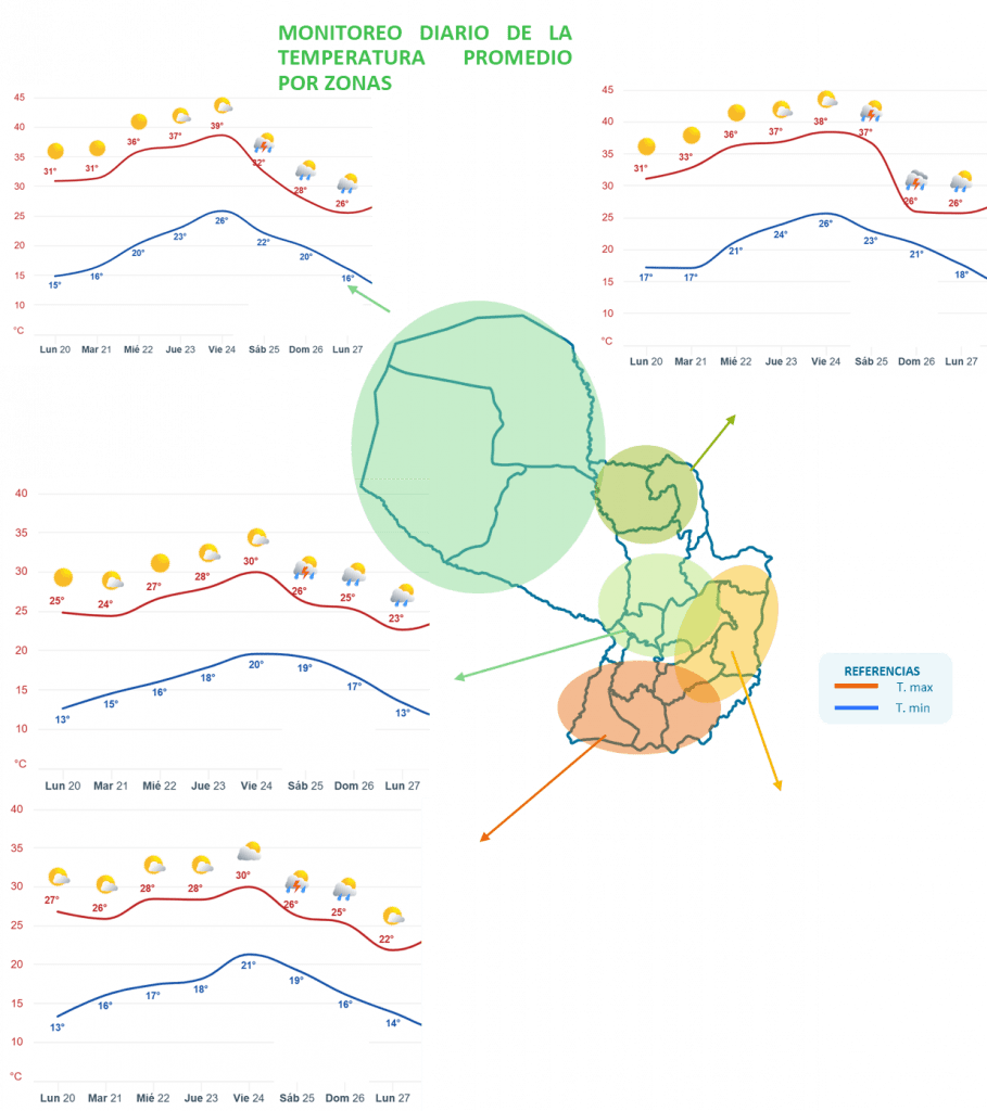 En la Región Occidental, se prevén valores máximos que podrían alcanzar o superar los 35 °C, especialmente en sectores de Alto Paraguay y Boquerón, mientras que en algunas zonas del departamentos de Concepción, y San Pedro, las temperaturas máximas se ubicarían entre 33 °C y 34 °C. En el centro y sur de la Región Oriental, las máximas oscilarían entre 24 °C y 27 °C, con condiciones más frescas hacia el sureste.