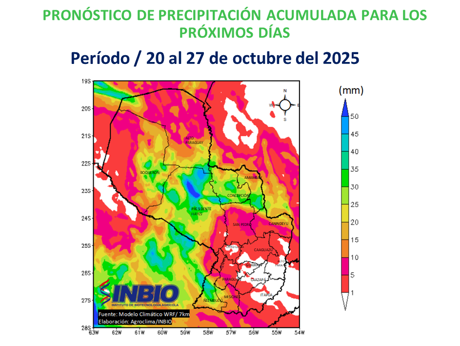 El análisis del pronóstico de precipitación acumulada para los próximos días, muestra la probabilidad de lluvias moderadas a puntualmente intensas sobre gran parte del territorio nacional, especialmente en zonas puntuales de la Región Occidental, y sectores del norte de la Región Oriental, donde los acumulados podrían superar los 40 a 50 mm.