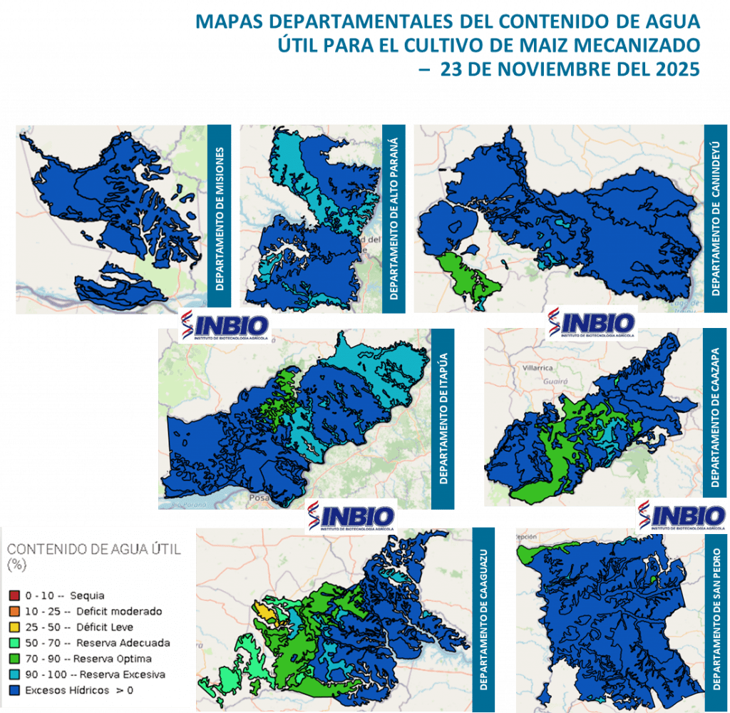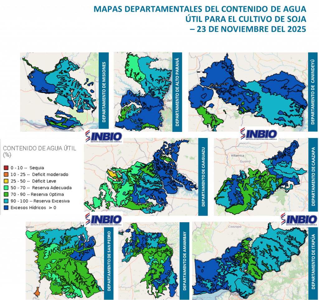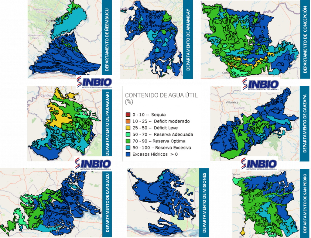 De acuerdo a lo observado, las condiciones de disponibilidad de agua en las unidades de suelos de los Departamentos monitoreados, presentan estados que se encuentran entre “Déficit Leve (25-50%) y Excesos Hídricos”. A la fecha del análisis la mayoría de los suelos cuentan con reservas de humedad en relación a las necesidades hídricas del cultivo. Estas condiciones estarían asociadas al régimen pluviométrico, las características físicas del suelo y la evapotranspiración.