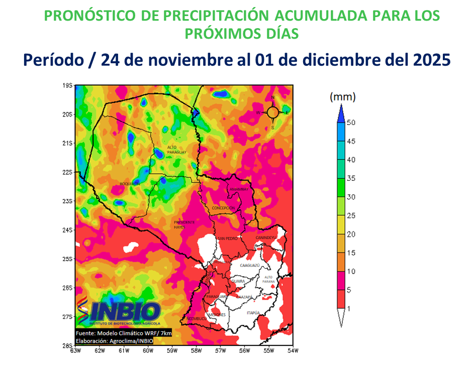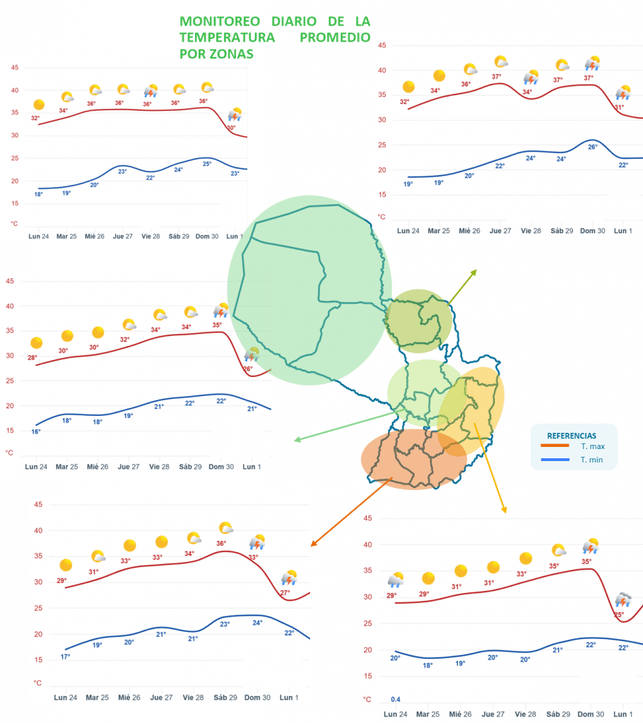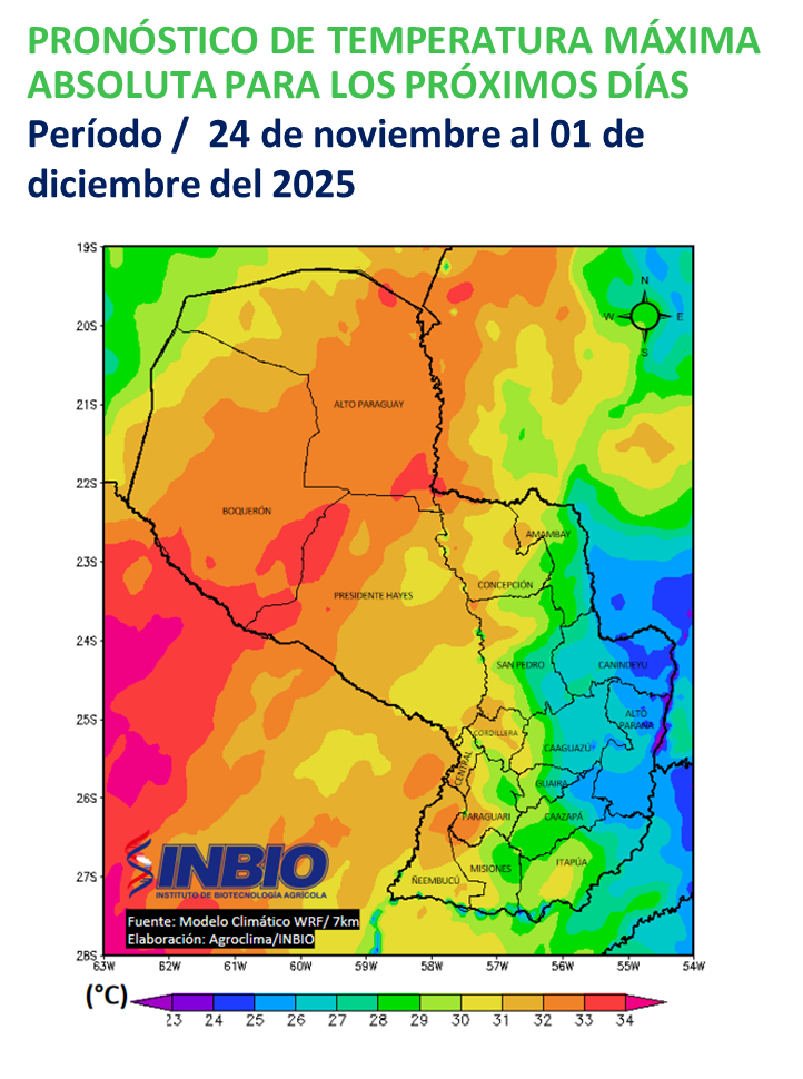 El pronóstico de temperaturas máximas para los próximos días indica valores que, en general, oscilarán entre 25 °C y 34 °C, con los registros más elevados concentrándose en sectores de la Región Occidental y en el centro–sur de la Región Oriental. Estas condiciones térmicas, ejercerán una influencia importante sobre la evapotranspiración de los cultivos y, en consecuencia, sobre el balance hídrico del suelo.