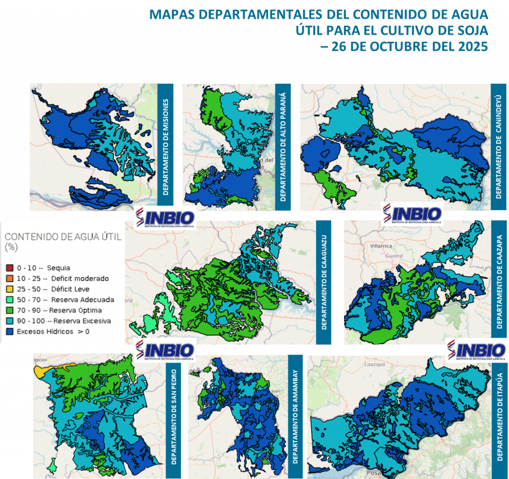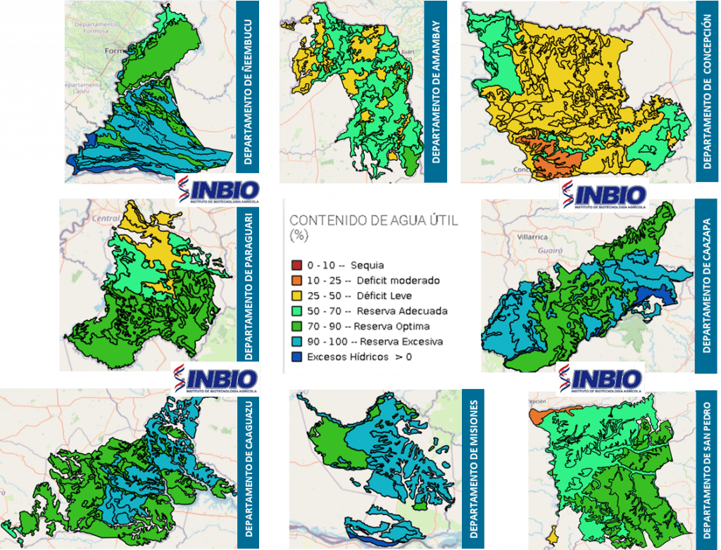 De acuerdo a lo observado, las condiciones de disponibilidad de agua en las unidades de suelos de los Departamentos monitoreados, presentan estados que se encuentran entre “Déficit Leve (25-50%) y Excesos Hídricos”. A la fecha de análisis la mayoría de los suelos cuentan con reservas de humedad en relación a las necesidades hídricas del cultivo. Estas condiciones estarían asociadas al régimen pluviométrico, las características físicas de los suelos y la evapotranspiración.