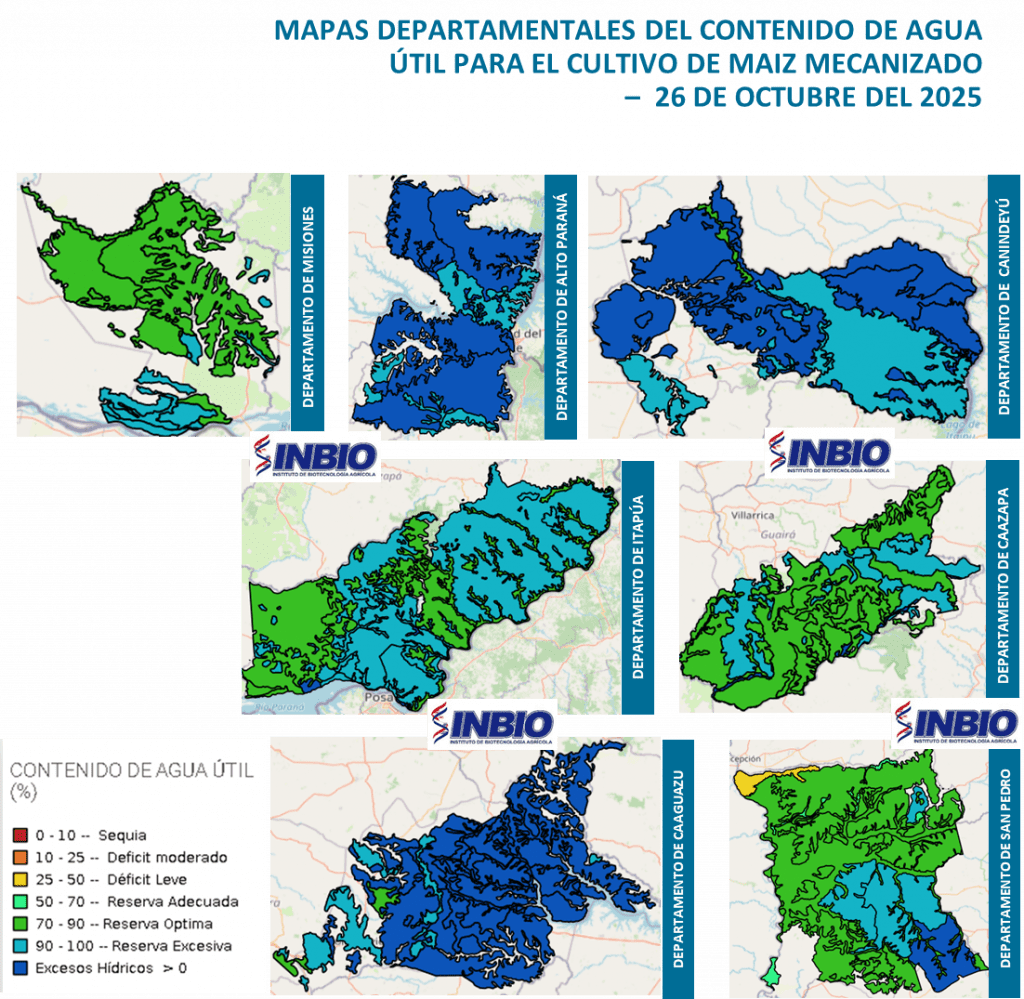 De acuerdo a lo observado, las condiciones de disponibilidad de agua en las unidades de suelos de los Departamentos monitoreados, presentan estados que se encuentran entre “Déficit Moderado (10-25%) y Excesos Hídricos”. A la fecha del análisis, la mayoría de los suelos cuentan con reservas de humedad en relación a las necesidades hídricas del cultivo. Estas condiciones estarían asociadas al régimen pluviométrico, las características físicas del suelo y la evapotranspiración.