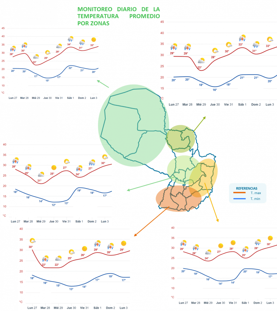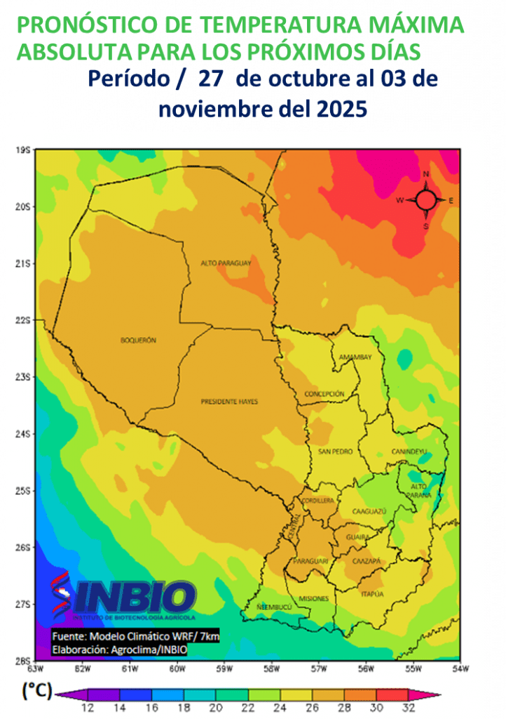 El pronóstico de temperatura máxima para los próximos días indica un gradual incremento térmico en gran parte del país, con los valores más altos previstos sobre el Alto Chaco y el norte de la Región Oriental. En la Región Occidental, las máximas podrían alcanzar o superar los 35 °C, especialmente en sectores de Alto Paraguay y Boquerón, mientras que en zonas del norte de la Región Oriental (Concepción y San Pedro) se estiman valores entre 31 °C y 33 °C.