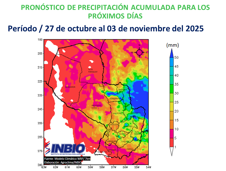 El análisis del pronóstico de precipitación acumulada para los próximos días, muestra la probabilidad de lluvias moderadas a puntualmente intensas sobre algunos sectores del territorio nacional, especialmente en zonas puntuales del norte noreste, y algunos núcleos del sureste de la Región Oriental, donde los acumulados podrían superar los 40 a 50 mm.