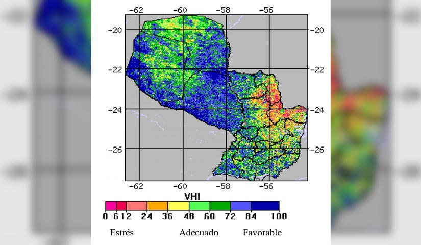 El Índice de Estado de Salud de la Vegetación (VHI) obtenido, mediante Imágenes Satelitales MODIS, es empleado para estimar la condición del cultivo y el posible rendimiento anticipado. Si los índices se encuentran por debajo de 48, indican un nivel diferente de estrés de la vegetación y se podrían esperar pérdidas de producción de cultivos y pasturas.