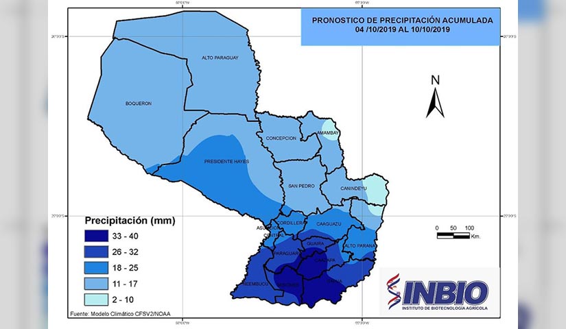 Según lo pronosticado por el modelo climático, en el siguiente mapa se representan los rangos de precipitaciones pronosticadas en el periodo comprendido entre el 04 al 10 de octubre del 2019.