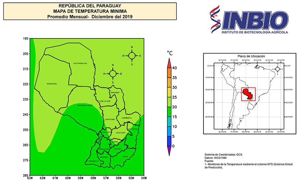 En el mapa de precipitación (acumulado mensual del mes de diciembre del 2019), se observa que para el periodo en consideración tuvimos una distribución abundante de precipitaciones en algunas zonas del país, específicamente en la zona norte y parte del noreste del Región Oriental, con rangos que superaron los 250 mm. En tanto que para la Región Occidental también se tuvieron buenas precipitaciones específicamente en el Bajo Chaco con rangos entre los 150 a 200 mm.
