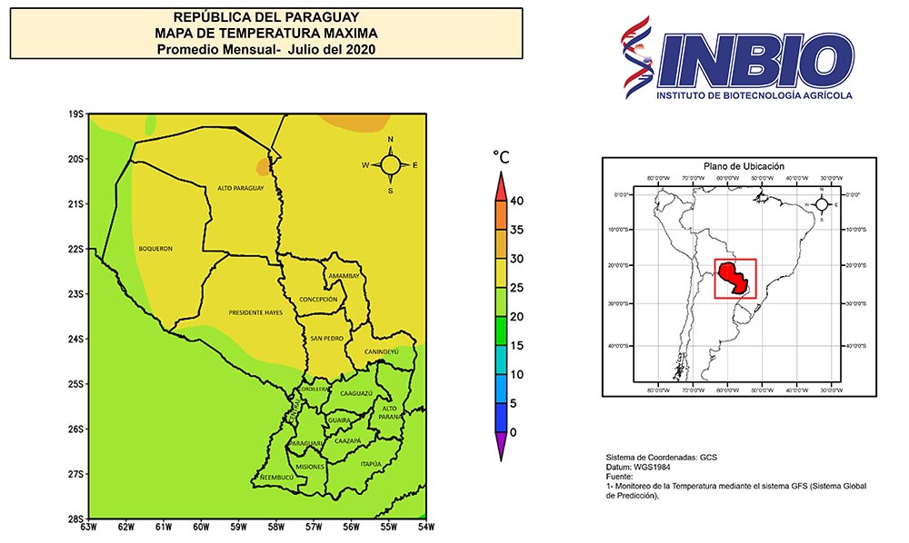 El mes de julio del 2020, se registró rangos muy bajos en cuanto a los registros de la temperatura mínima, en este periodo se observaron heladas agronómicas de época normal (Invernales) sobre algunas zonas en el territorio nacional. Estos rangos se presentaron específicamente en la zonas, centro, sur, suroeste y sureste de la Región Oriental, como así también en el extremo oeste de la Región Occidental y en algunas áreas del Bajo Chaco.