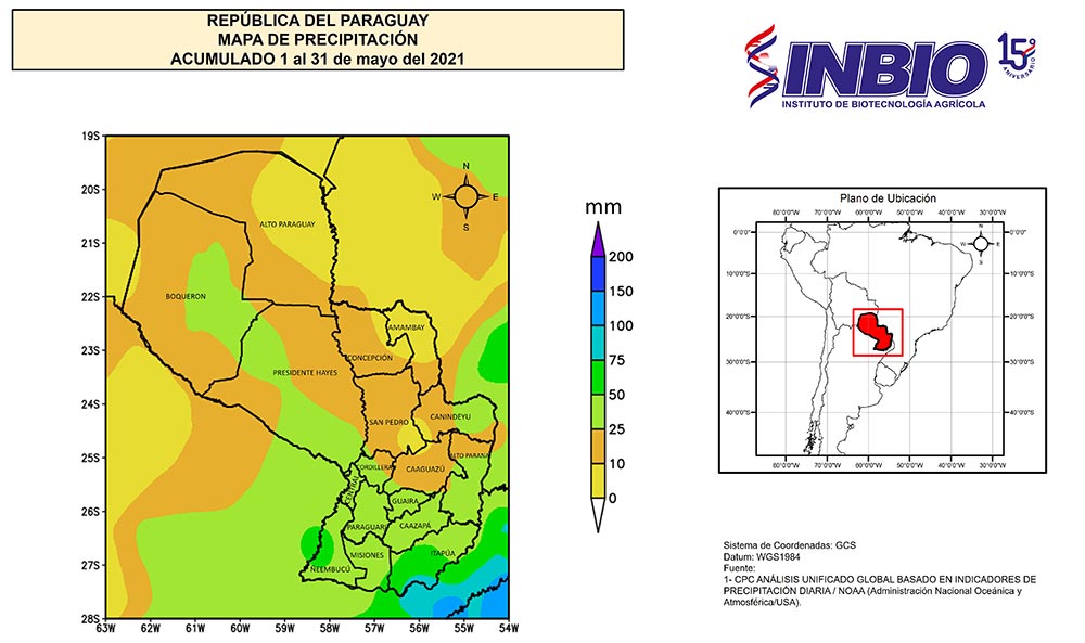 En el mapa de precipitación mensual, observamos que el mes de mayo del 2021, la distribución de las lluvias en el mes fue bastante variable sobre el territorio nacional, donde se registraron acumulados desde niveles escasos a moderados sobre algunos sectores, con más predominancia de niveles deficitarios sobre el territorio, los valores máximos llegaron al rango de los 75 a 100 mm y se concentraron sobre el sur de la Región Oriental.