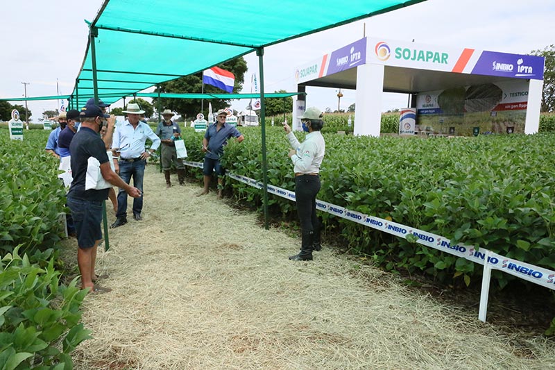 Durante el evento, el Instituto de Biotecnología Agrícola (INBIO) presentó las variedades SOJAPAR R19, SOJAPAR R24, SOJAPAR R34 y SOJAPAR R49 las mismas son el resultado de la alianza público – privada, entre el Instituto Paraguayo de Tecnología Agraria (IPTA) y el INBIO. En la oportunidad se brindó informaciones de las cualidades y características de las variedades SOJAPAR presentadas, entre ellas muy especialmente la forma en que actúa el gen de resistencia a roya que poseen las variedades, el cual facilita el manejo del cultivo, disminuye el uso fungicidas y genera economía al productor, además de brindar la sanidad necesaria a las plantas para mantener su potencial productivo.